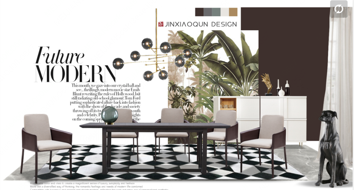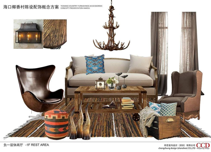 氛围图也是空间属性(文化格调),看到空间的第一印象,整个设计的文化脉络的来源,文化承载在衣食住行的物体中,再用设计的手法表现出来,这是带领客户欣赏方案的第二步:氛围图(意向图)