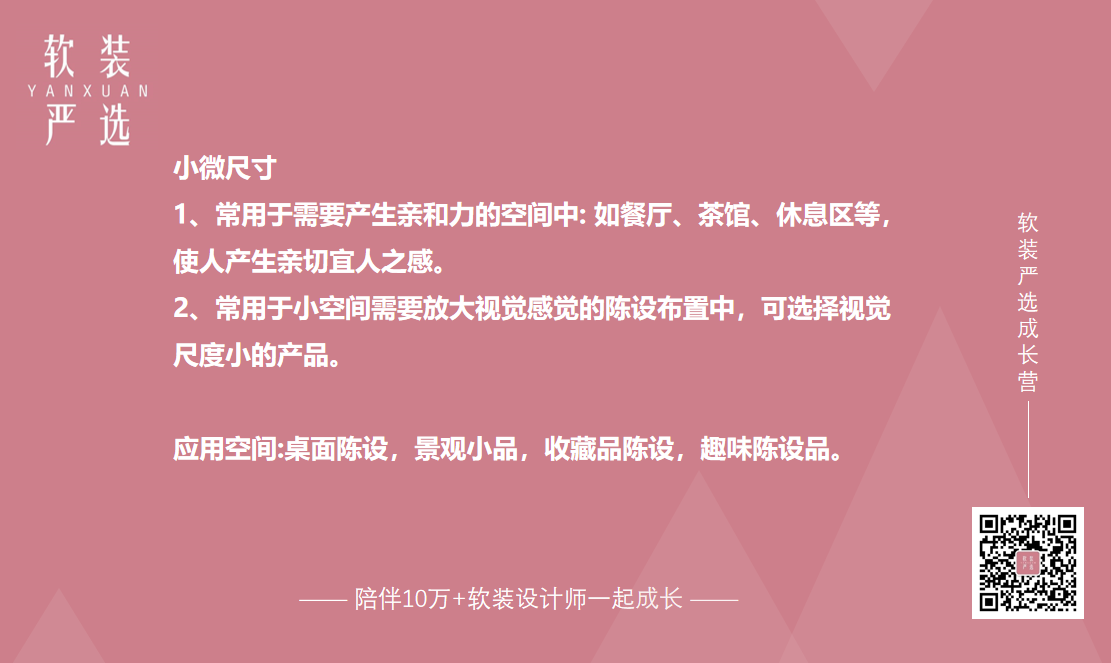 小微尺度是指陈设品的形态尺寸小于人们熟知的尺寸,物体比实际尺寸小一些,令空间和环境大一些的尺度形式。