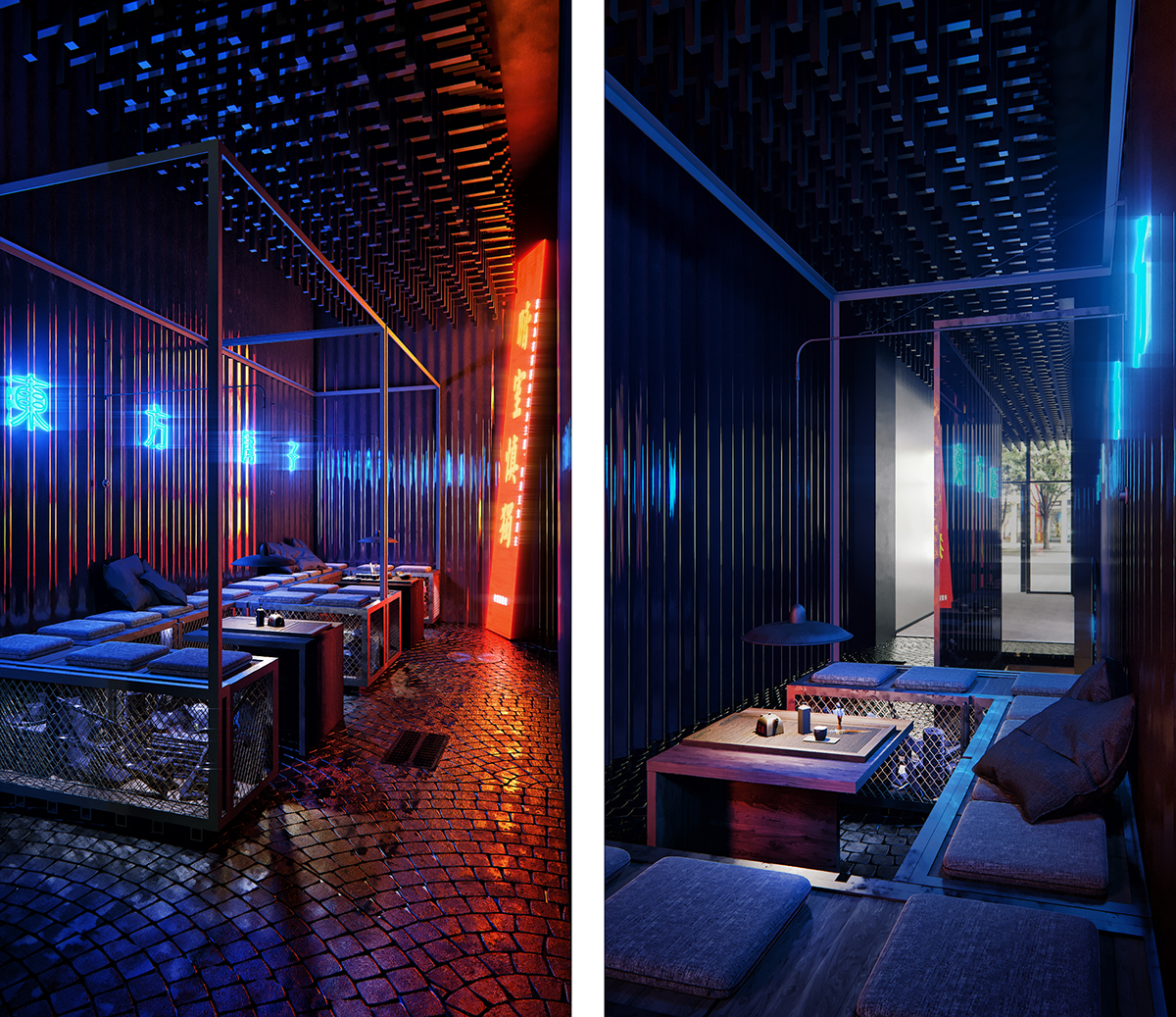 元素:霓虹灯、数字化、复古汉字、工业矿灯、笼子、重复的线条