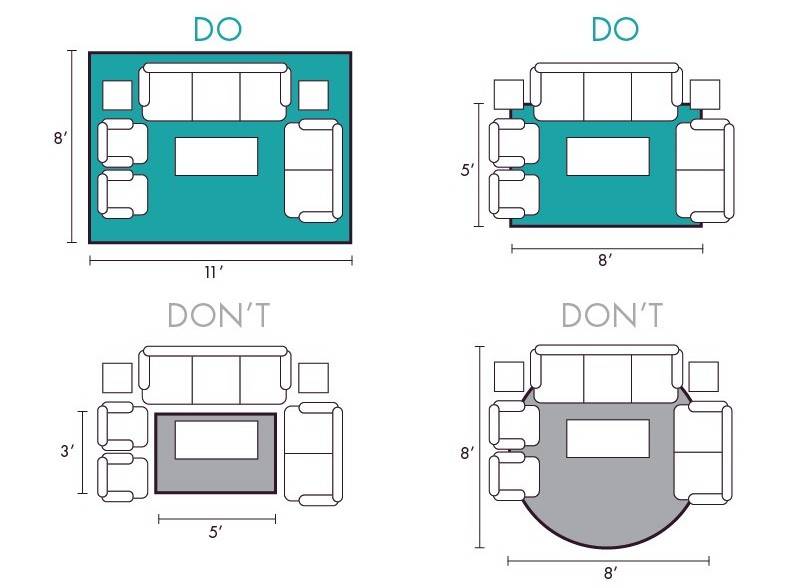 以下为客厅会客区地毯铺陈效果最理想的方式,家具大小都要纳入考量范围,确保地毯、沙发和茶几间保持标准的比例。