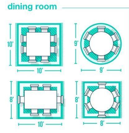 进行简单的测试就知道,将饭桌的椅子拉开到客人使用时的距离,地毯应该容纳所有拉开的椅子。餐厅地毯形状呼应餐桌的形状:方桌,长桌,圆桌等形式。
