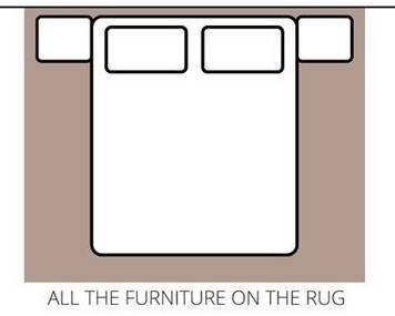 方法2:同样确认好家具的摆放,然后以摆放家具的前腿踏上地毯为准,确定合理的地毯尺寸。此法比较常用。