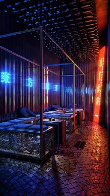 元素:霓虹灯、数字化、复古汉字、工业矿灯、笼子、重复的线条