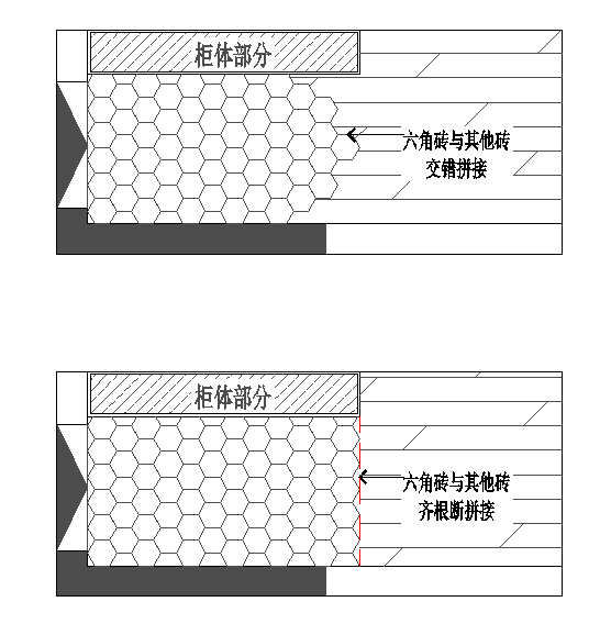 交接处有如下两种处理方式①交错拼接 ②齐根断拼接。齐根断式简单一些,没交错拼接有设计感,两种拼接方式都要考虑到一个收口问题。是直接留缝(3-4㎜)还是用收口条(如不锈钢条)处理。在设计的时候就要考虑进去,泥工交底同师傅讲清楚。