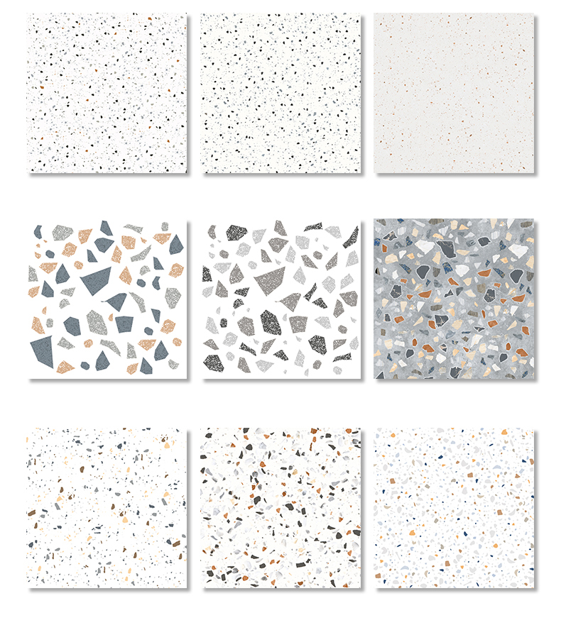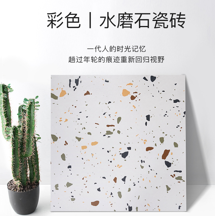 水磨石砖:通常指的是仿水磨石砖。水磨石是岁月磨积下来的生活气质,是一种怀旧的情怀。常见尺寸600×600㎜、800×800㎜.