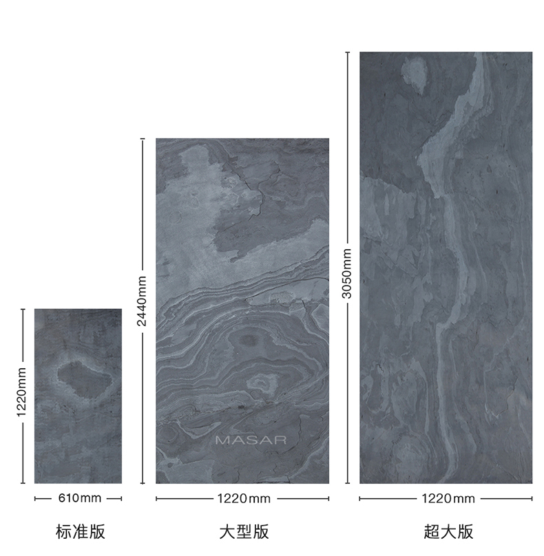 岩板:岩板常与陶瓷大板混淆,但岩板与大板是完全不同的两个产品。陶瓷大板,是日常生活中人们对大规格瓷砖的统称,原材料多由粘土、石英等混合而成。岩板是由天然矿物岩石及高岭土经特殊工艺生产加工而成,属于全新的建材品类。主要尺寸有750x1500mm、900x1800mm、1200×2400㎜、800x2600mm、1600×3200㎜,厚度有6mm、9mm、12mm、15mm;