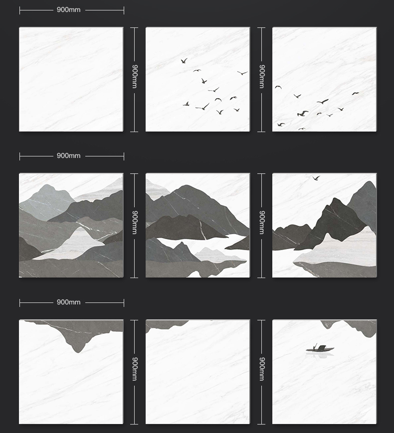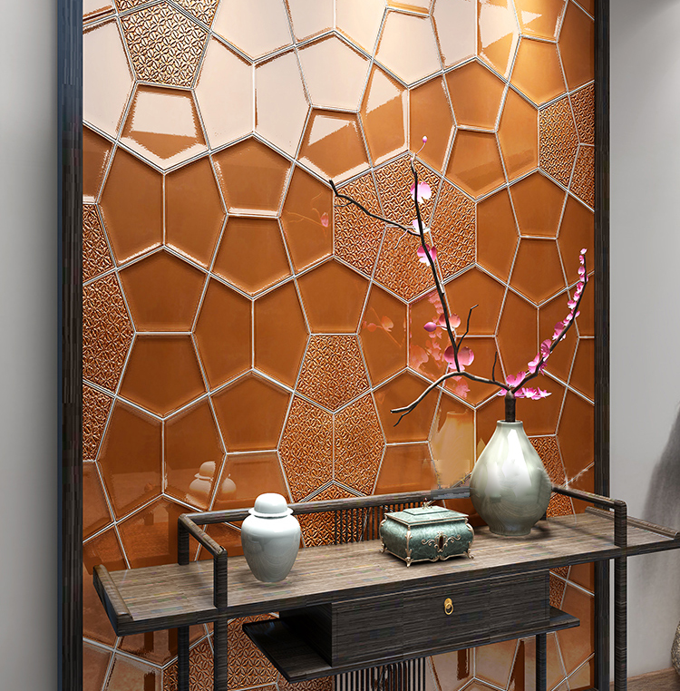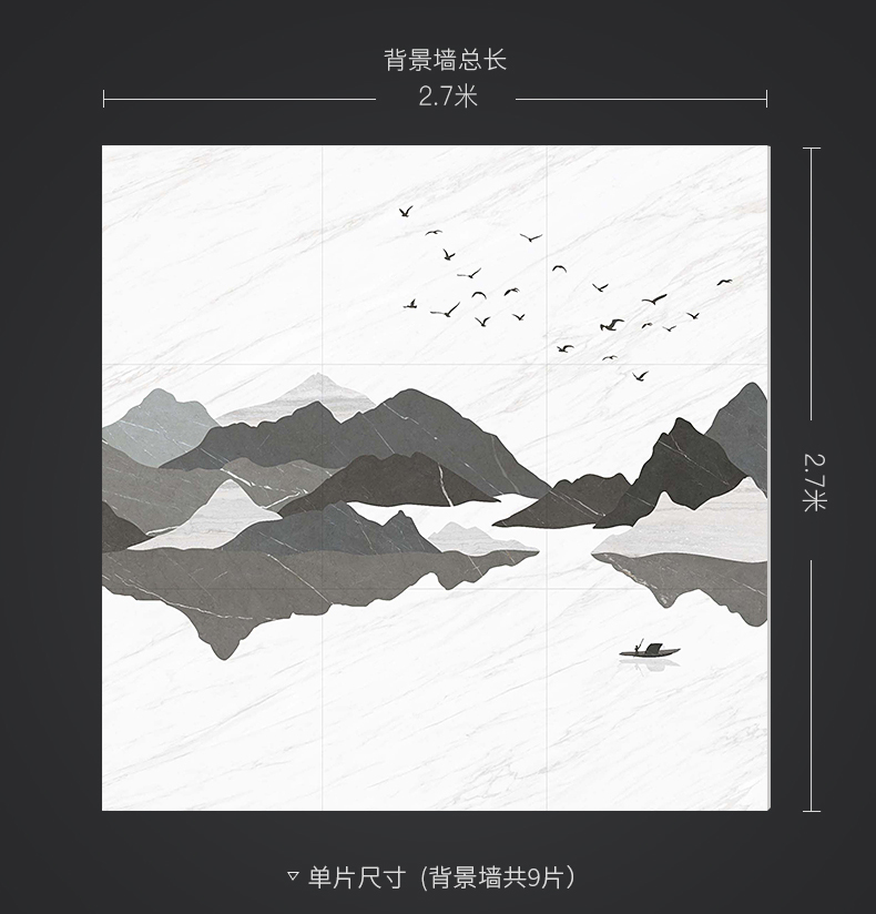背景墙砖:又称瓷砖画。背景墙往往是空间的点睛之作,为了打造一面效果惊艳的背景墙,常会用到跟风格相关的精美壁纸图案,大都通过定制壁画布的形式,但很多业主并不喜欢墙布,我们可以用背景墙砖替换。