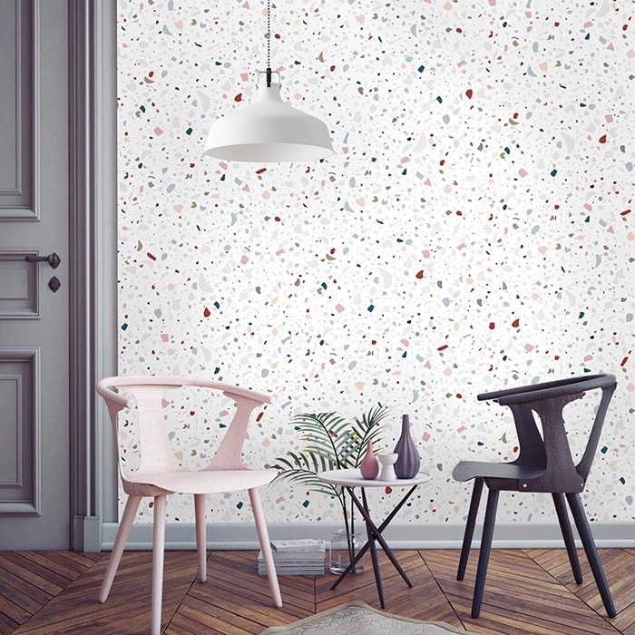原水磨石是将碎石、玻璃、石英石等骨料拌入水泥粘接料制成混凝制品,后经表面研磨 、抛光的成品。仿水磨石瓷砖,是仿效水磨石逼真纹理的一类瓷砖产品,它不像水磨石那样施工复杂、工序繁琐,直接用水泥沙浆铺贴施工即可。