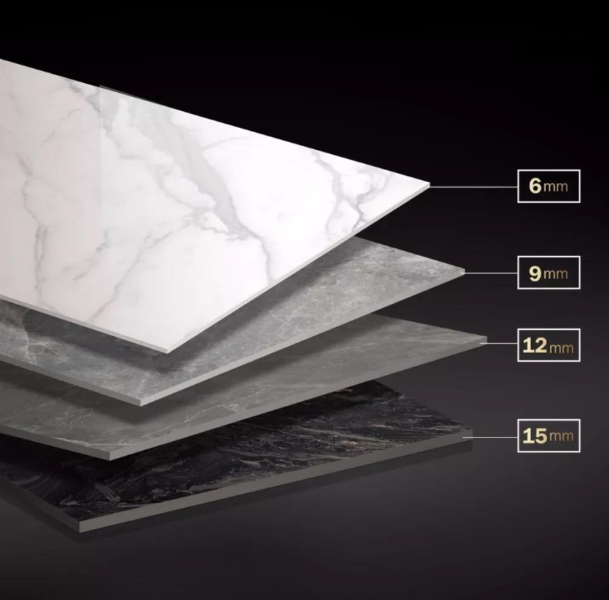 Ps:6-9 mm岩板常用于墙面造型,12-15mm厚岩板常用于橱柜台面、中岛台等地。