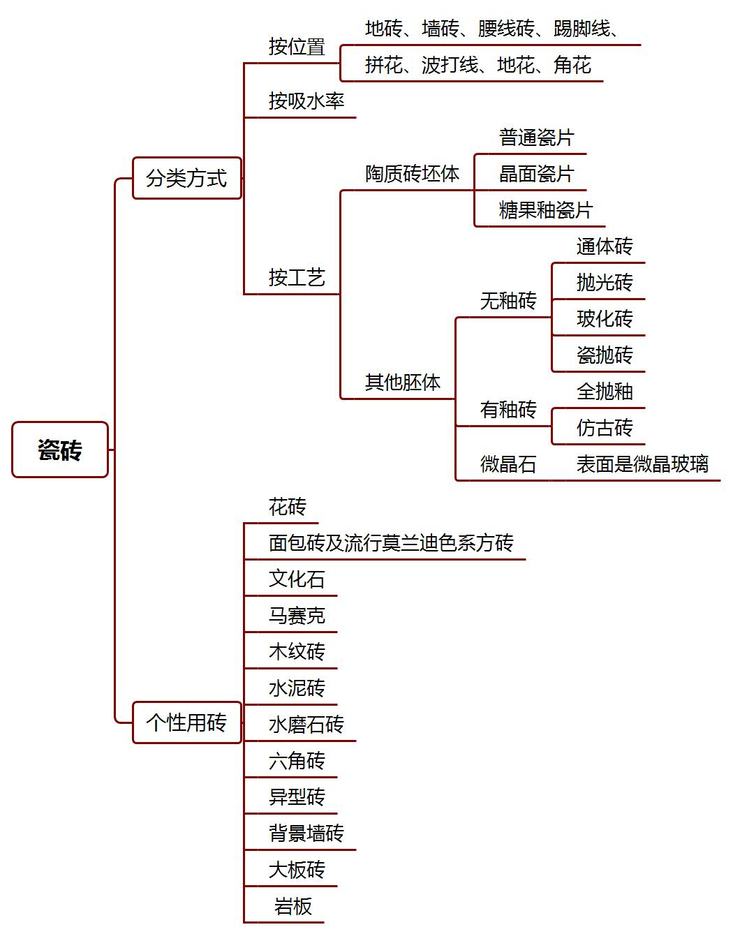 ①通过三种不同的方式介绍了瓷砖的常见分类,如按位置、按吸水率、按工艺都是怎么分的。