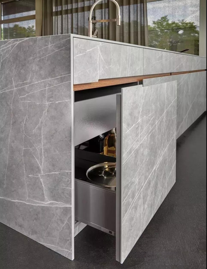 Ps:岩板原材料中高岭土作为塑性材料,它的颗粒细、粘度高、可塑性强。因此,岩板相比大板,韧性更强。进行切割、磨削、倒角等二次加工不易破损。所以岩板不仅能应用在墙地面,还能应用在橱柜、电视柜、浴室柜、中岛台、桌子、门板等家具表面。同时还有木纹、布纹、大理石等更多饰面风格选择,让家居设计更加多样化。