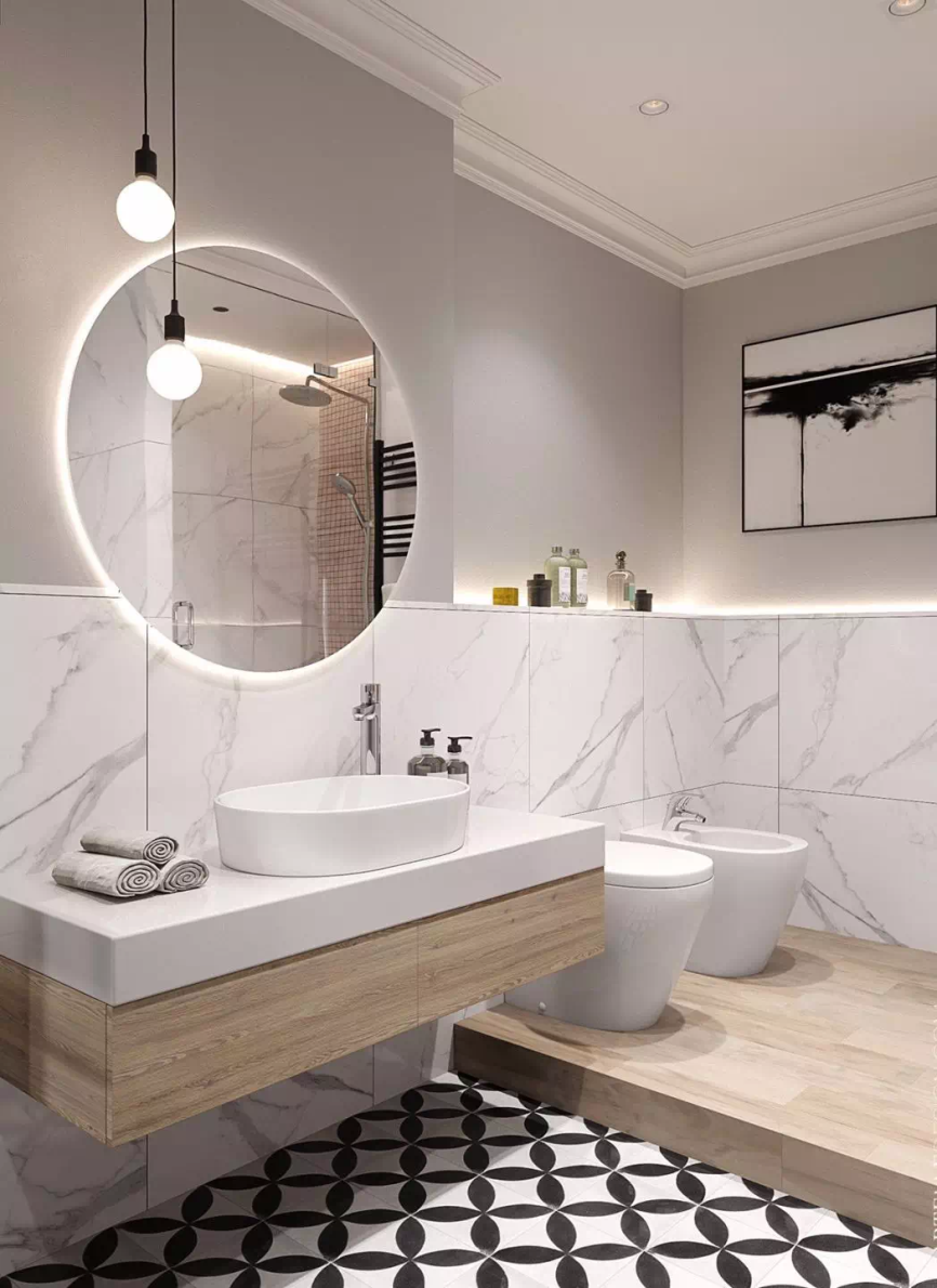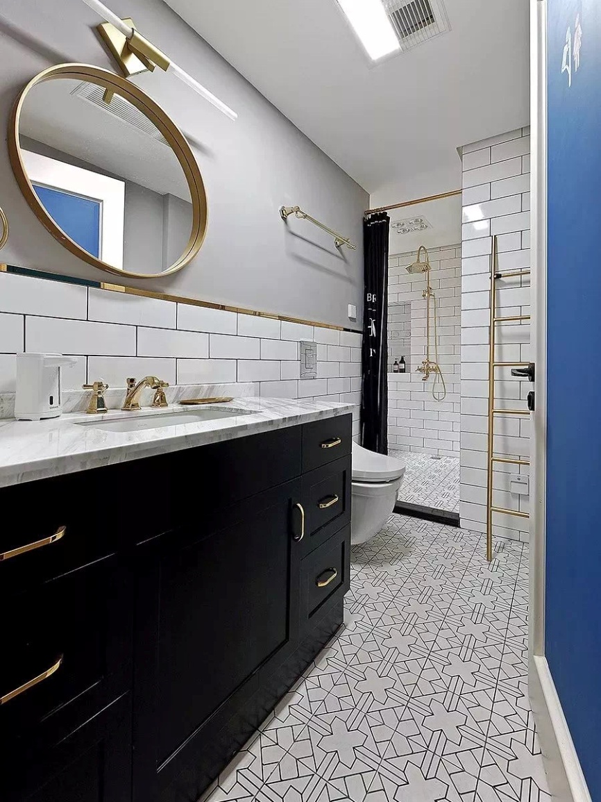 A:腰线铺贴要避免与卫浴设备重叠。比如腰线被浴室柜挡住、淋浴龙头的出水阀位置在腰线上(如果是立体凹凸感的腰线,会严重影响美观),这些都是要尽量避免的。