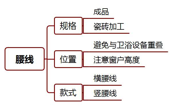 ①从规格、位置、款式介绍了设计师在腰线设计师需要注意的事项,重点强调了在位置设计时设计师一定要注意避免腰线被浴室柜挡住、花洒出水阀在凹凸线上等交底问题,以免后期返工赔偿。