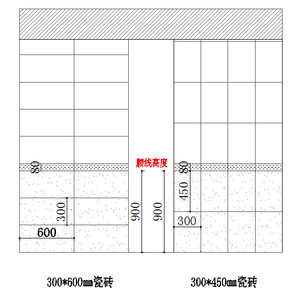 由于卫生间我们常用300*600㎜、300*450㎜这两种规格的瓷砖,贴300*600㎜时腰线通常贴3块整砖之上(因为放坡问题,有的地方需要稍微切割),贴300*450㎜砖时贴2块整砖之上。施工图纸示意如下。