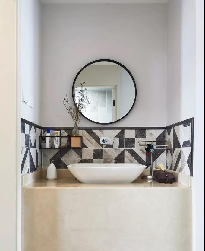 卫生间:除了上面介绍的常规卫生间腰线设计,目前卫生间也存在很多瓷砖只贴半墙的设计,常见于干区。这时候我们通常用腰线或不锈钢条收口(当然也有不收口的情况)。