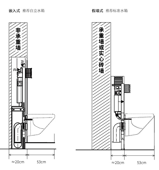 2:非嵌入(假墙):靠墙安装,做假墙把水箱包起来。假墙可以砌一半如900㎜高,也可以做满墙。假墙厚度最小在150-200㎜之间,可结合壁龛等各种储物做在一起,实用,美观,整体性强。
