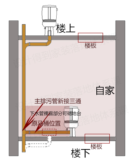方法二:找楼下邻居协商,重新在楼板上打洞。原始卫生间布局实在不合理的,其实很容易跟邻居达成协商,因为他家也面临这样的情况,你改了他也会改,和谐你我他。麻烦的是虽然有不合理但无关大雅的很多不愿意让改,这个就看业主和邻居的关系了。