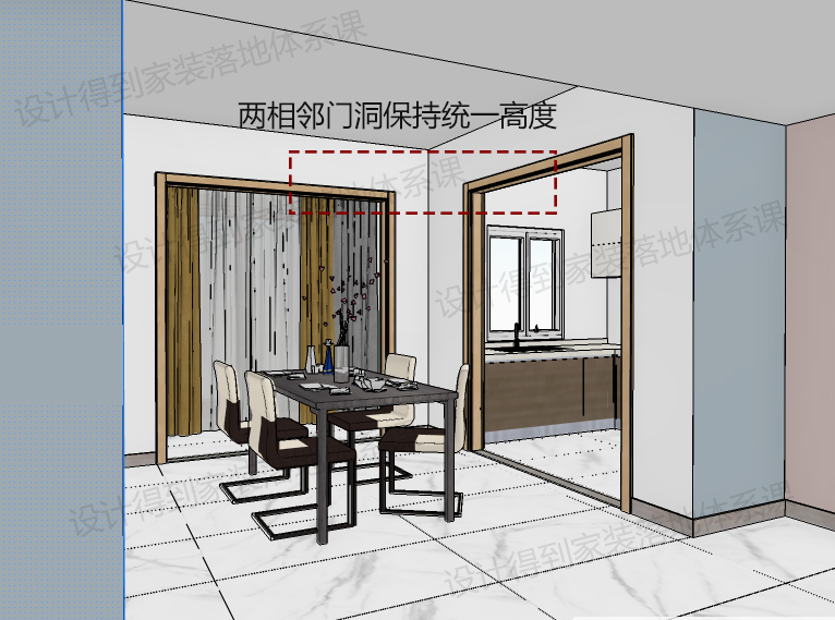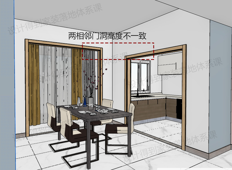 ③ 门套的高度问题必须重视,要尽量保持门套统一高度。不错落,视觉上才有整体感。此种情况常见于厨房与生活阳台靠近,但门洞高度不一的情况。那么在设计初期,我们就要根据实际情况加高或者降低门洞,达到统一高度的目的。(后期工地再加很容易有扯皮)通过如下示范案例大家可明确看出。