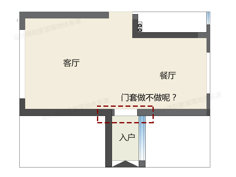 说起门套,首先碰到的可能是装不装的问题,在很多情况下,门套其实大可不必,毕竟造价也摆在那里。比如像如下的户型结构中,从入户到客餐厅之间这里有一个门洞,过道形入户本就不宽,取消线框处的门套,空间只会更宽敞。