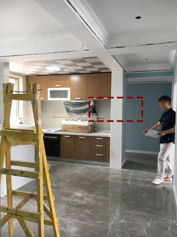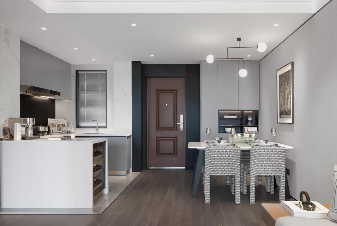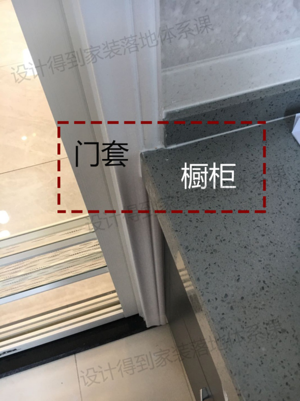 例二如下图,此案例中设计的是开放式厨房,在橱柜一侧贴的是瓷砖,过道一侧刷的墙漆,在两种材质交界处,必然存在收口上的不美观,那么也可以用包门套的方式来处理。