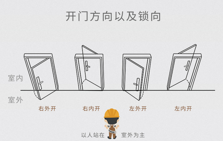 防盗门通常情况下有四种开的方向,右外开、右内开、左外开、左内开。在商品房中,防盗门通常是外开的,使用方便。