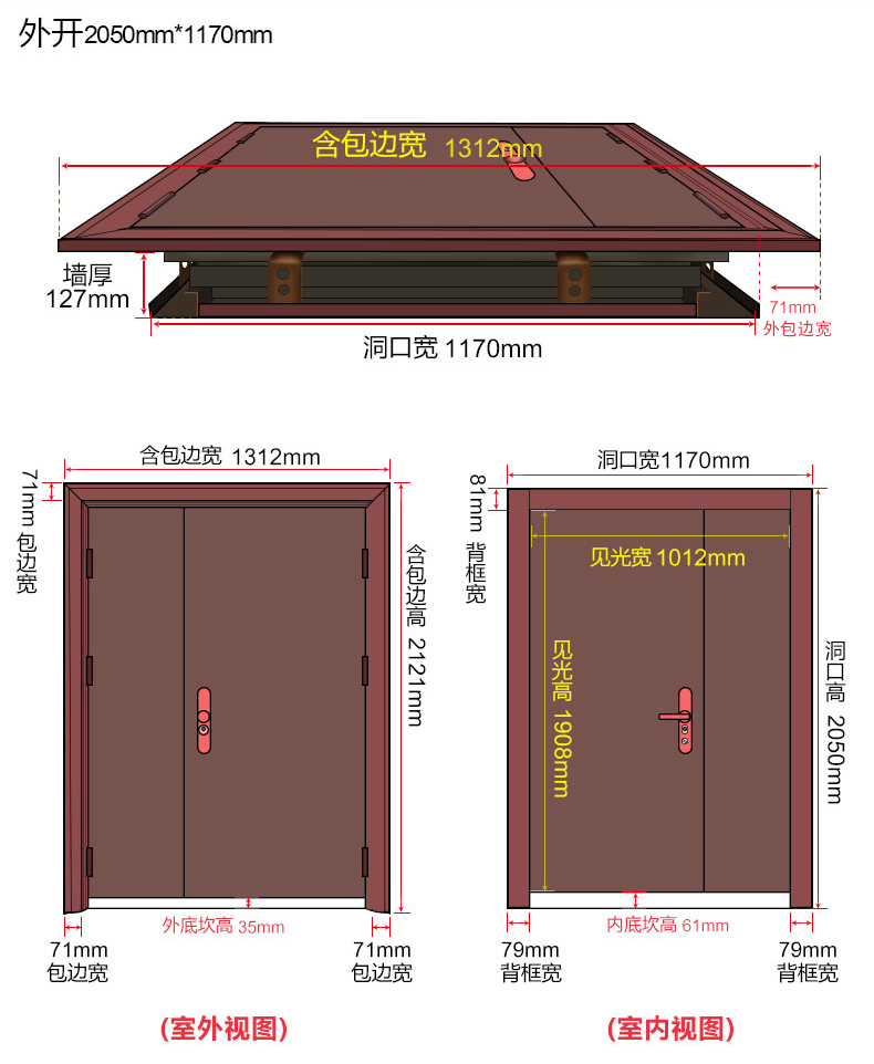 而双开门的常规宽度则是1160㎜、1200㎜、1300㎜,高度同上。
