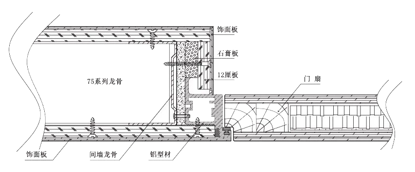 推拉式隐形门:常用在厨房门洞过窄的情况。节点图示意如下。如果厨房是双推门两侧都可以做成如下图结构。平时不用的时候推到墙体里,好像开放式厨房一样。用的时候拉上,一点也不占用空间。唯一的缺点就是不好搞卫生和维修。