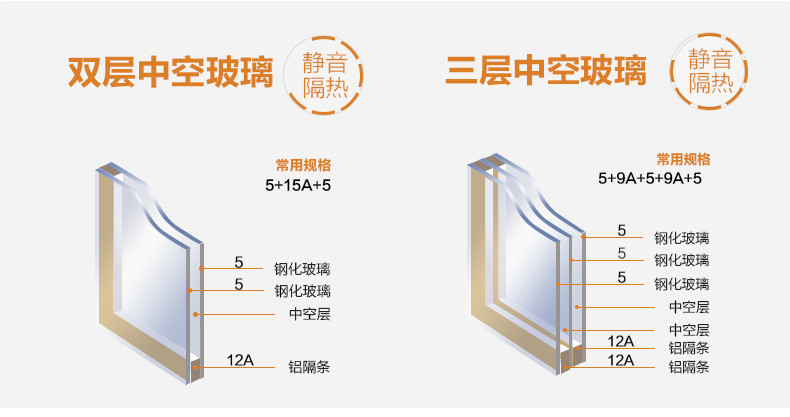 由上,我们得知,玻璃的材质大致是如上两种,普通钢化玻璃,钢化+镀膜玻璃。然后通过玻璃的组合,就有了以下三种窗户玻璃的组成形式。