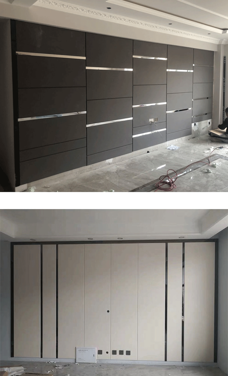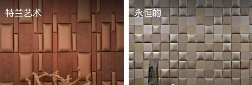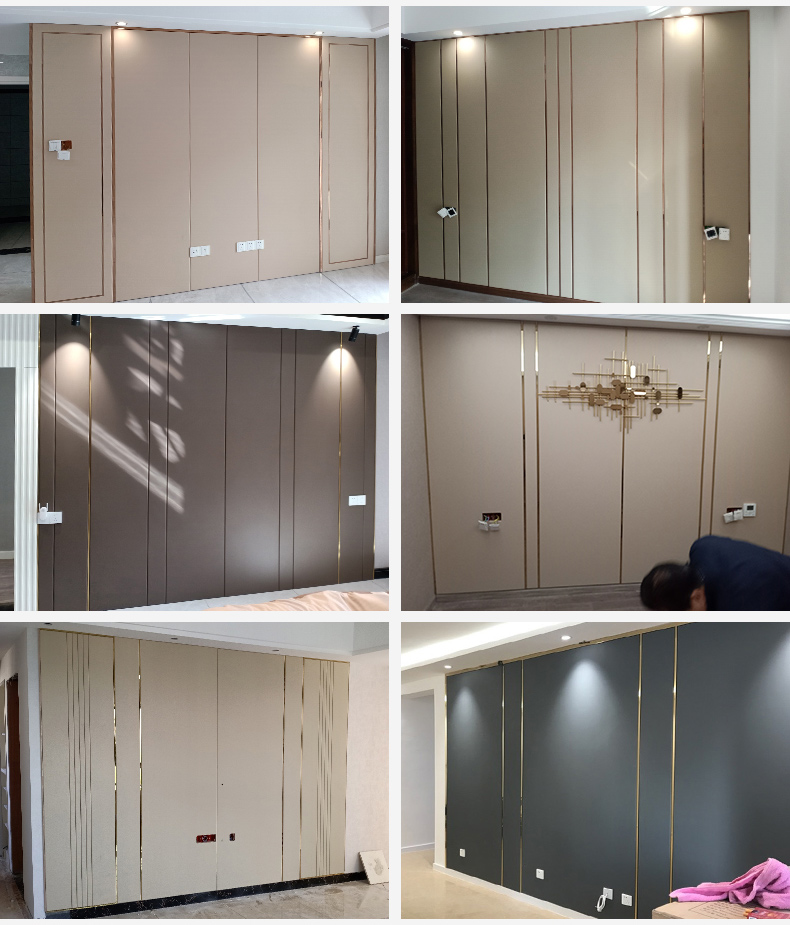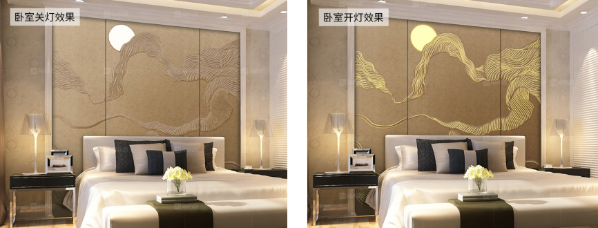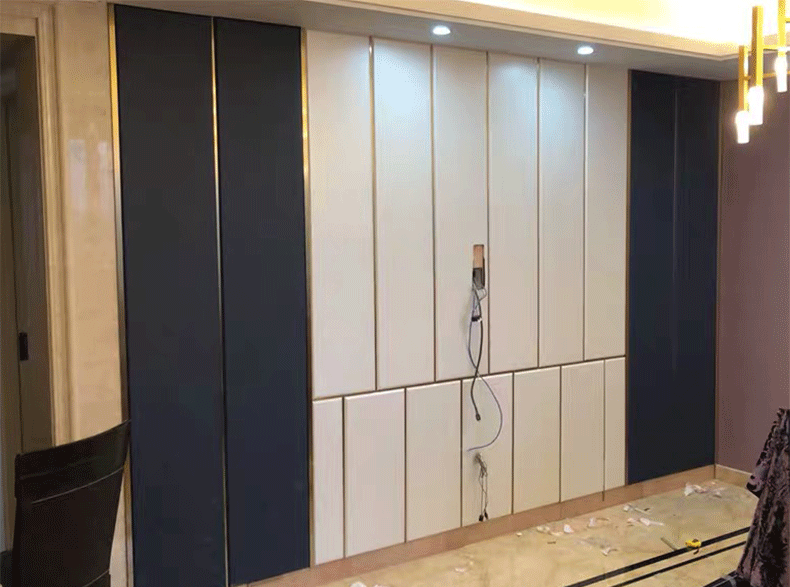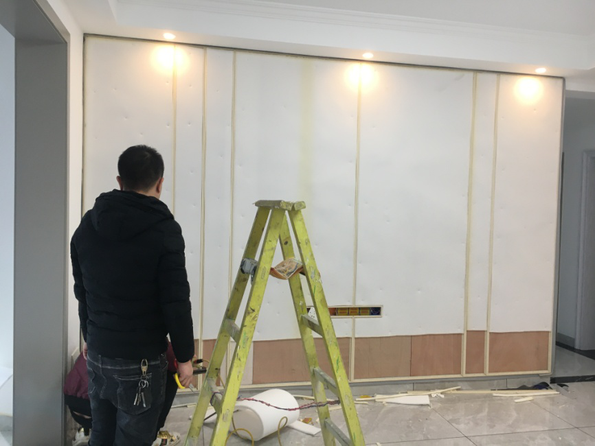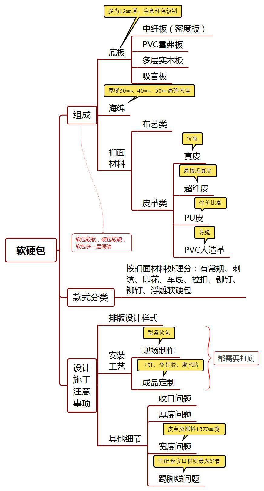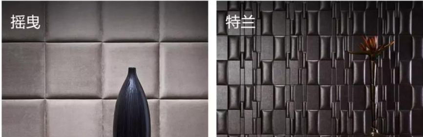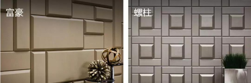 #关键词:#软硬包#个性用材# 通识# 导读 装修中很多业主都喜欢用到软包或硬包,软硬包漂亮美观,艺术性强,且容易打理,是墙布的升级版。 上一期我们学习了墙纸墙布在设计和施工中的注意事项,今天我给你分享的是软硬包的相关知识点,本期主要解决以下知识点: 1:软硬包的组成。 2:软硬包的款式分类。 3:软硬包的设计施工注意事项。 首先给大家介绍第一个知识点。 软硬包组成结构是什么? 软包、硬包是室内空间设计经典元素,常运用在背景造型中,如电视背景、沙发背景、床头背景。 他们的区别从触觉上区分:硬包摸起来较硬,软包摸起来较软。底层和面层是一样的,软包比硬包中间多了一层芯(海绵)而已,他们的结构如下。 硬包:底板+扪面材料 软包:底板+中间层海绵+扪面材料 用以下图示就比较形象了。 如上就是软硬包的区别,软硬包的价格从两百多到一千多的都有,价格悬殊取决于各组成部分的材质和做工。下面我将分开给你讲解。 软硬包的基层: 软硬包的基层底板大部分是12㎜厚,不少商家采用的是密度板。如果想要更好一点的材质,通常需要加价升级。无论使用如下哪一种,一定要注意环保级别是否达到。下面我将常见底板给你做好整理。 ① 中纤板:高密度密度板的一种。有6㎜、9㎜、12㎜。一般做软包用9㎜,做硬包是12㎜。(6㎜一般发生在客户边框做低了的时候才会用到) ② PVC雪弗板:有9㎜、12㎜两种,因为硬度较高,常用于生产皮雕软包。 ③ 多层实木板:多层板一般是客户升级产品,常用于生产浮雕产品。 ④ 吸音板(聚酯纤维板):吸音板属于特定材料,一般用于降音降噪的地方,他的最大特点就是吸音。同样有9㎜、12㎜两种,价格比上三种高。 软包的海绵层: 海绵:市场上很多软包使用的是回收材料制作的海绵,弹性差,颜色发黄发灰,选择高弹海绵,软包塑形丰满,不变形。 软硬包的表层: 软硬包的扪面材料主要有两大类:布艺和皮革。 布艺的话不用多说,常见绒布、棉麻,甚至我们上期讲过的墙布材质都可做成软硬包的材质。 至于皮革,常见四种如下。 ① 真皮:由黄牛皮直接加工而成,表面有原始的皮肤特征,毛孔、皮肤纹理清晰,具有良好的强度、弹性,光泽手感度一流。 ② 超纤皮:汽车座椅采用皮,超细纤维制造而成,耐磨耐刮,质量仅次于真皮,但价格却比真皮优惠,性价比较高的一种皮料,保用十年以上,是最接近真皮的一种。 ③环保PU皮:(又称西皮)手感柔软,更接近皮质面料,它不用增塑剂来达到柔软的性质,所以他不会变硬、变脆,同时具有色彩丰富、花纹繁多的优点,价格又比皮质面料便宜,是大部分软硬包厂家选用的皮料。 ④ PVC人造革:他是由PVC加增塑剂和其他的助剂制成,优点是价格便宜、色彩丰富、花纹繁多,缺点是轻易变硬、变脆。 软硬包的款式分类 款式问题:硬包的款式很多种。如果按面料表面处理来分,常分为常规、刺绣、印花、车线、拉扣、铆钉、铆钉、浮雕软硬包,下面我将一一给你展示。 普通软硬包:常规布料上不做任何处理的软硬包,价格最低。 车线硬包:在硬包表面车线,常见皮革类硬包表面的处理。 格调车线硬包细节图↑ 铆钉硬包:在硬包表面钉铆钉,需要注意铆钉材质,铆钉不要容易生锈和褪色的材质。 拉扣软包:拉扣有皮质的也有水晶材质的,常按粒计价。拉扣可居硬包块中,或硬包拼接处,常用于床头背景。 刺绣/印花硬包:高端的刺绣硬包价格昂贵,比较彰显品位,常用于电视/沙发背景。 格调刺绣硬包细节图↑ 浮雕软硬包:种类比较多,分割花、不割花、双色、透光等等。但无论是那种浮雕软包,都有其自己独特的特点。此类价格较贵,常用于别墅豪宅样板房项目中。 格调浮雕硬包细节图↑ 高端浮雕硬包↑ 如果是发光浮雕硬包,那么在施工初期我们就要预留好电线。 福布斯高端灯光浮雕↑ 学习完软硬包的基本产品知识,在陪同客户选购的时候,对于产品的好坏我们至少能帮业主参考啦。接下来我们进入第三个知识点的学习。 软硬包的设计施工注意事项。 软硬包运用广泛,在设计和施工中常需要注意以下几个问题。 1:软硬包的排版设计样式问题。 2:软硬包安装工艺讲解。 3:软硬包的其他施工细节。 下面我将一一给你讲解。 软硬包的排版设计问题。 软硬包的排版设计重点在于我们要多了解一些硬包的拼接款式,不要局限于简单的竖线款式。下面我将整理一些软硬包的款式供你排版设计参考。 第一类:常规线条分割款式。 第二类:异形。 软硬包的安装工艺: 软硬包的安装有两种方式,一种是现场制作,一种是成品定制,两种方法都需要木饰面打底,如遇造型,下方还可加轻钢龙骨。 现场制作流程大致如下: ① 木饰面打底。 ② 放线:在铺有底板的墙面上根据设计要求放线绘制图案。 ③ 钉型条:将型条按墙面划线铺钉。 ④填充海绵:如果是薄的海绵效果接近硬包。 ⑤ 插入面料:用插刀将面料插入型条缝隙。 ⑥型条收边 成品定制软硬包流程只有两步:先是木饰面打底,然后安装即可。成品硬包是一块一块的,安装主要有如下三种方法。 ① 枪钉:用气钉枪在软硬包的四个角和边缘打上汽钉固定即可。 ②用免钉胶直接粘贴,双面胶辅助,步骤如下,适合小块软硬包的安装,不建议如下直接在墙壁上粘贴,还是木饰面打底就为稳妥。 ③魔术贴:将魔术贴的勾面和毛面分别固定贴于打底面和软硬包背面,粘上即可,方便更换。