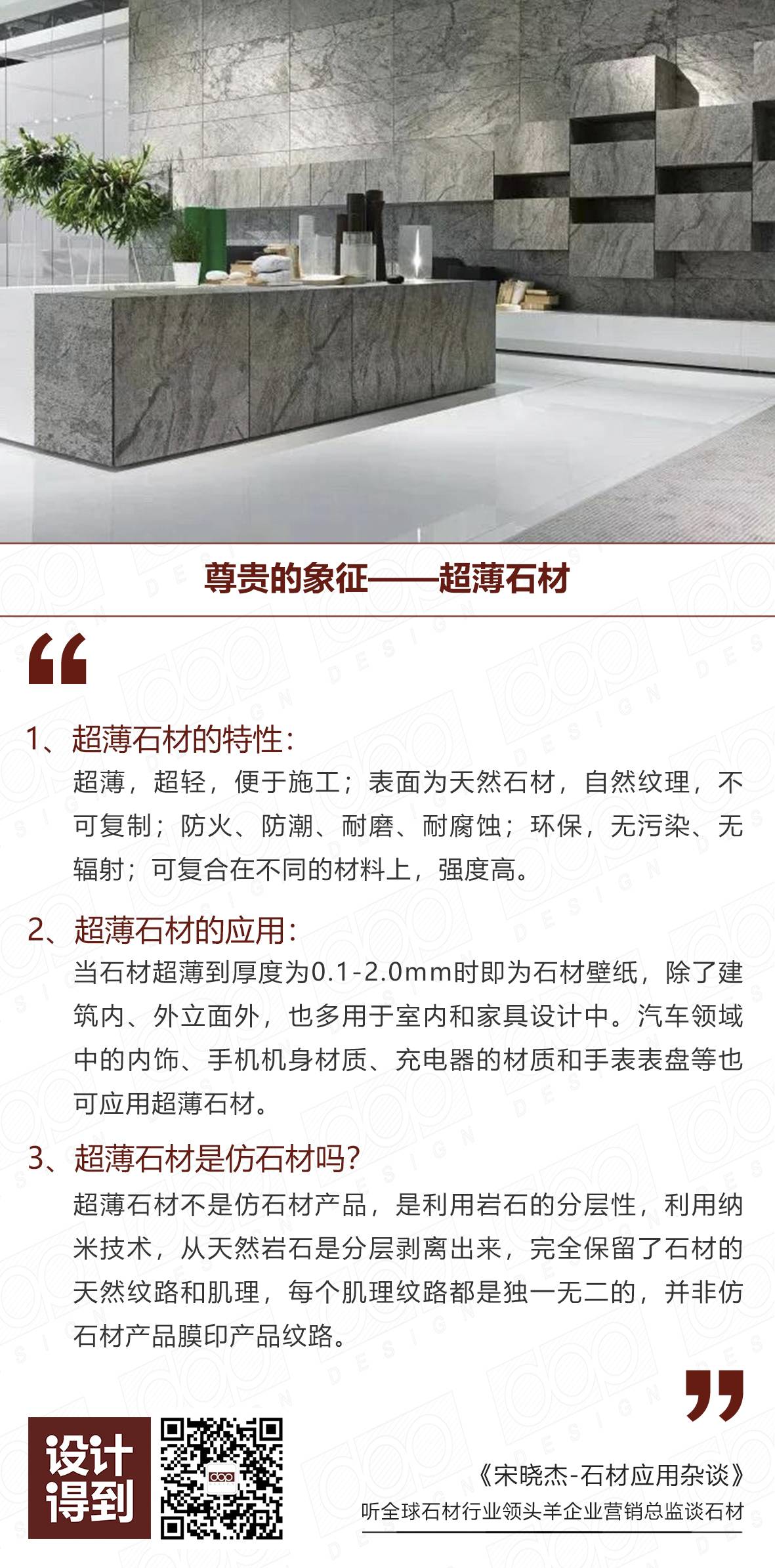 当石材超薄到厚度为0.1-2.0mm时即为石材壁纸,除了建筑内、外立面外,也多用于室内和家具设计中。