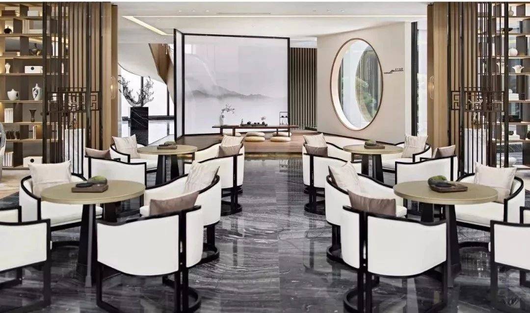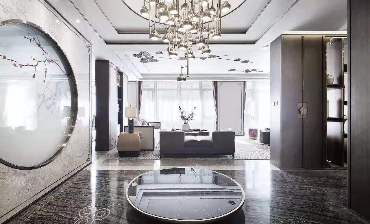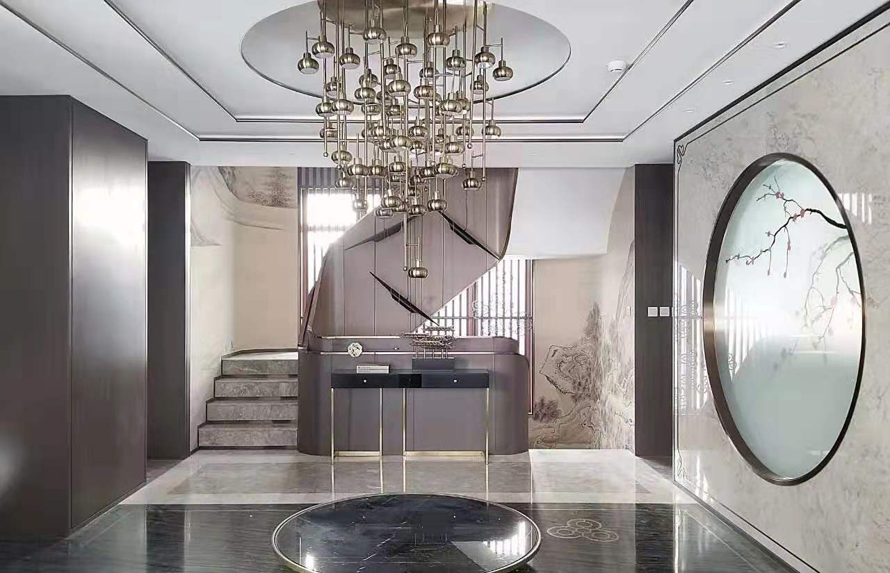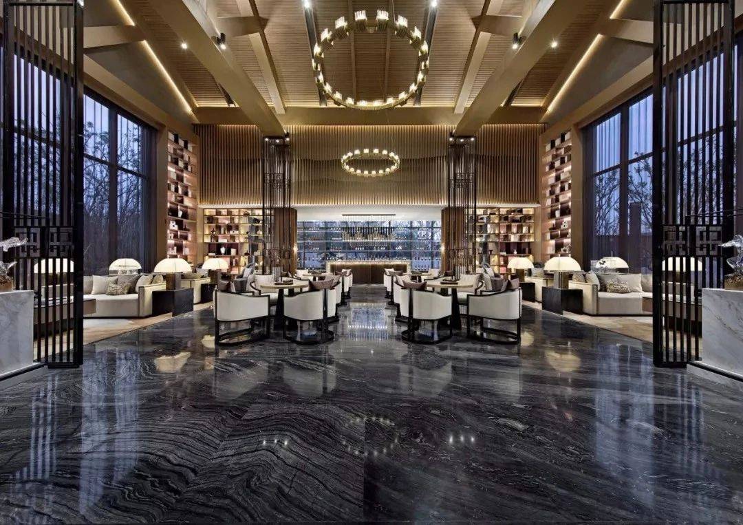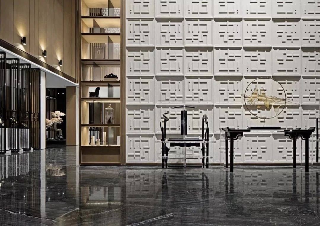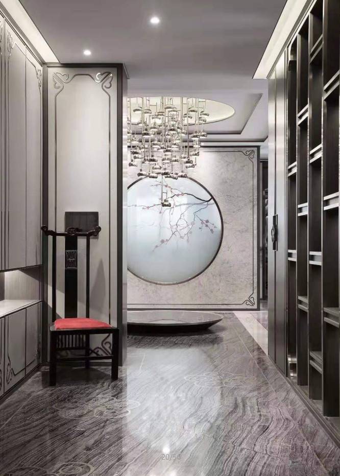 主要材料:古木纹大理石、黑白根大理石、古罗马灰大理石、爵士白大理石、圣雅米黄石材雕刻造型墙、夹丝玻璃、木饰面