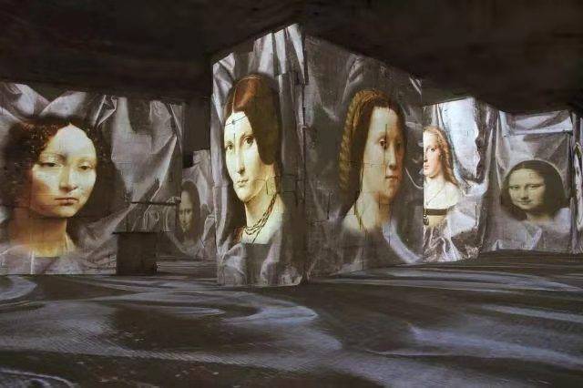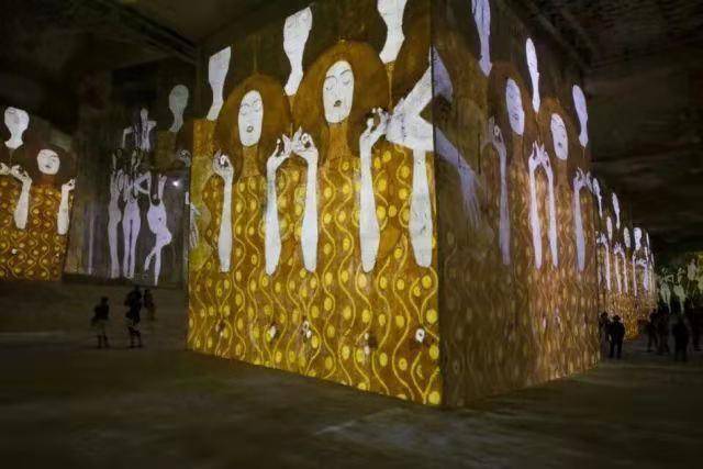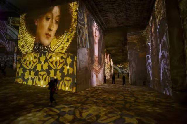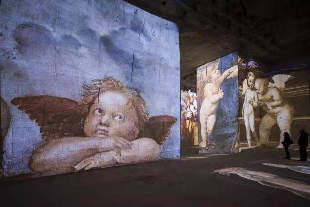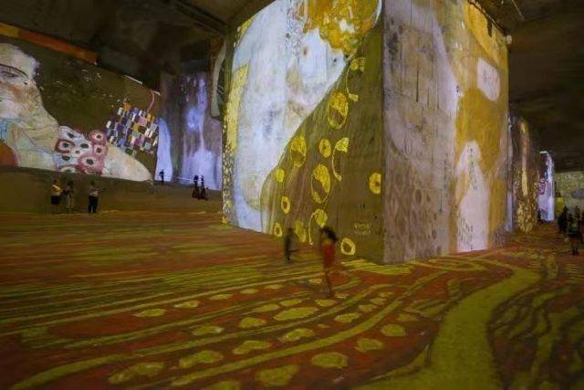 矿洞艺术馆四周是高高的墙壁,凹凸不平的石块形成了独特的屏幕,当那些经典画作被投射到墙壁和地板时,让你觉得自己好像进入了一个梦幻般的国度。