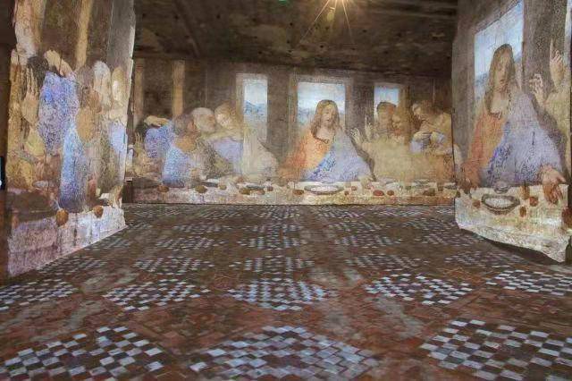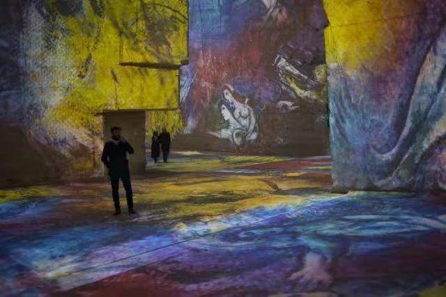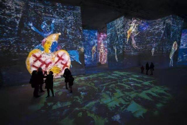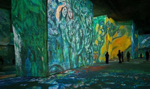 在这里,投影仪在墙壁、天花板和地板上进行绘画,相比传统的将画作挂在墙上,艺术品的静止图像和动画图像在整个空间中栩栩如生。