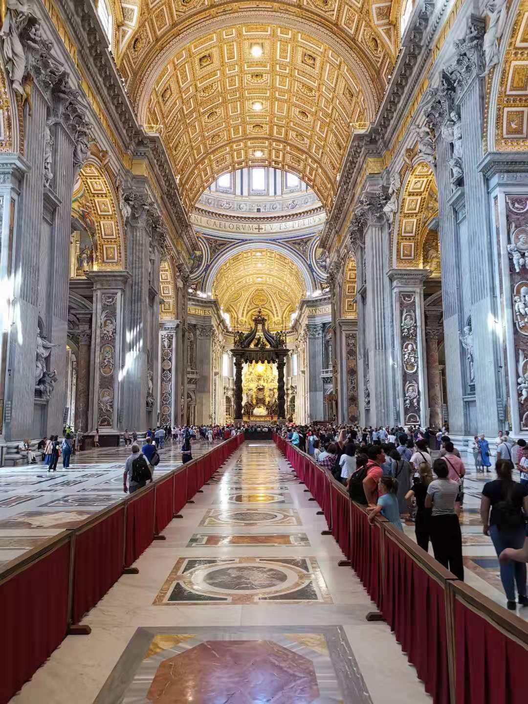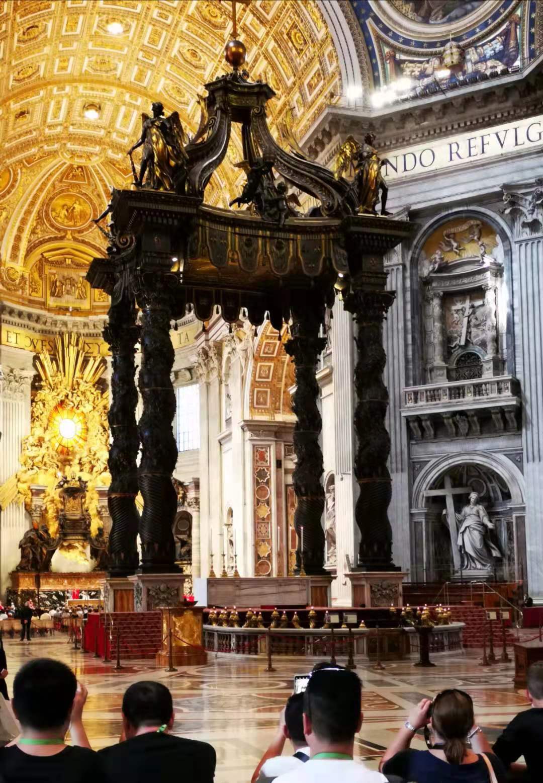 在米开朗基罗设计的大穹顶下,阳光透过彩色玻璃窗挥洒下来,把由巴洛克艺术之父贝尔尼尼的雕制的青铜华盖照得金光灿烂,给肃穆、幽暗的教堂增添了一种神秘的色彩。