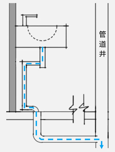 水流起于台盆,流向墙面立管,再到本层地面,经过倾斜放坡后流向本层的竖向管井,最后排往楼下。