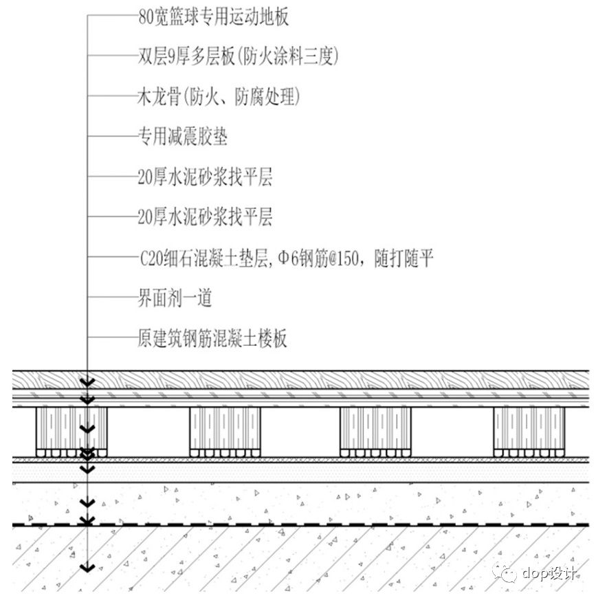 运动木地板的铺装和其它空间地板铺装还是有差别的,从工艺构造角度,运动木地板通常是采用“架空式”的安装,也就是先安装骨架的垫层(减震垫),安装基层的骨架,安装毛地板,然后铺贴运动地板。