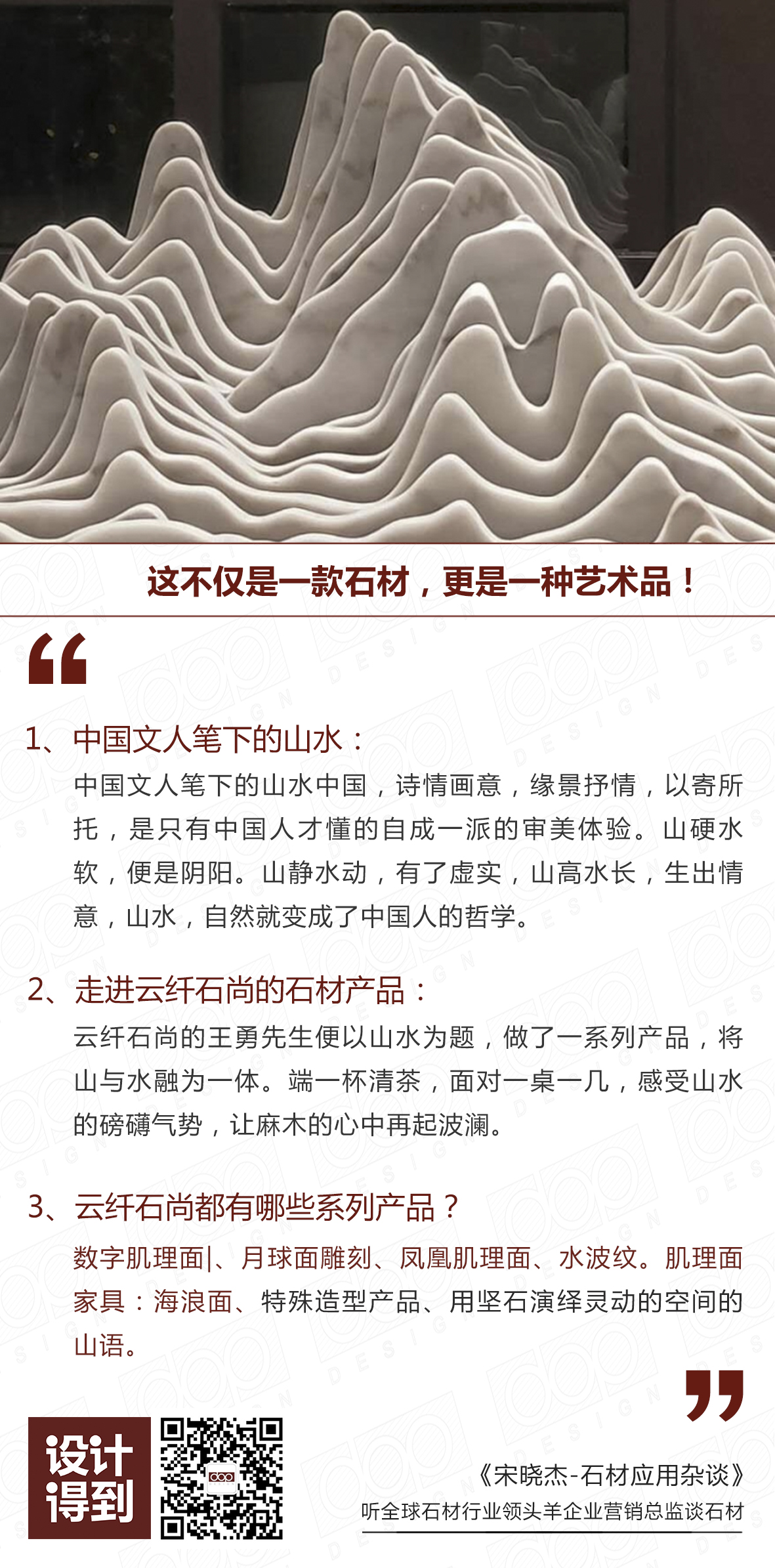 于是云纤石尚的王勇先生便以山水为题,做了一系列产品,将山与水融为一体。