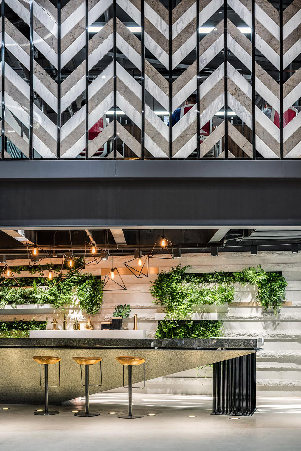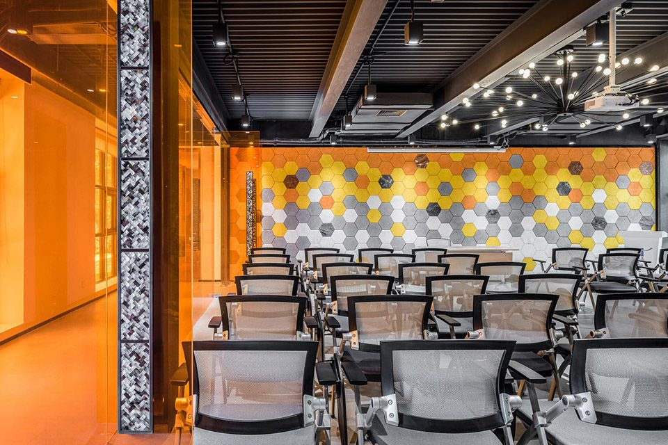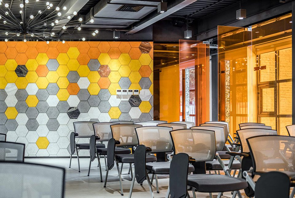 墙面的设计为六边形的吸音板与石材搭配而成,既可以起到吸音的功能,又可以展示石材,让人们可以了解到,石材可以有多种多样的用途,并非只是千篇一律的铺在地上,贴在墙上。