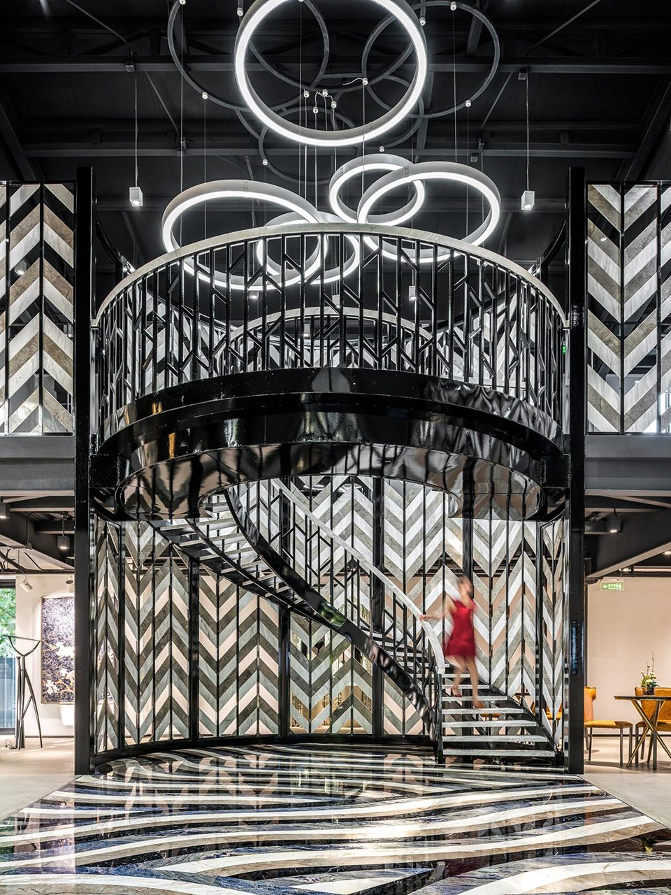 在W环形石头隔屏旋转而上,是将整体室内空间贯穿的语言,黑白灰W石材拼图,取自“万”字的第一个字母,石头隔屏既是形象也是楼上楼下的空间划分方式。