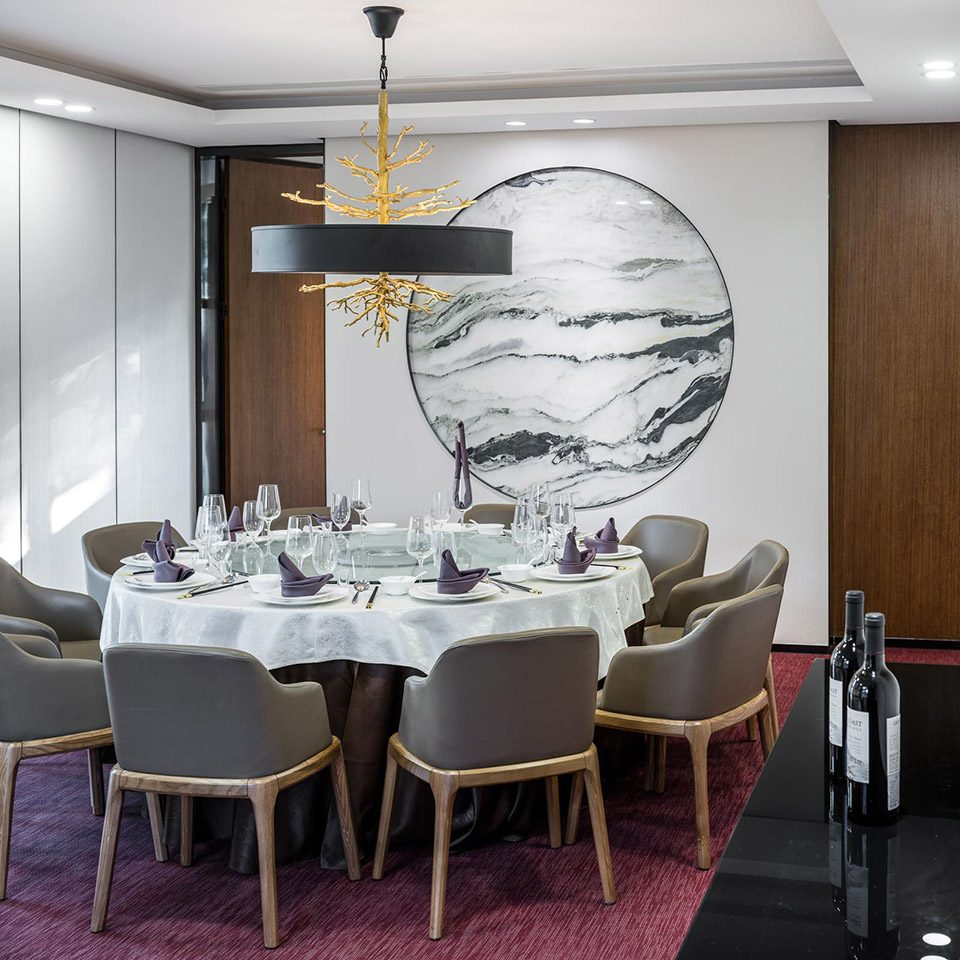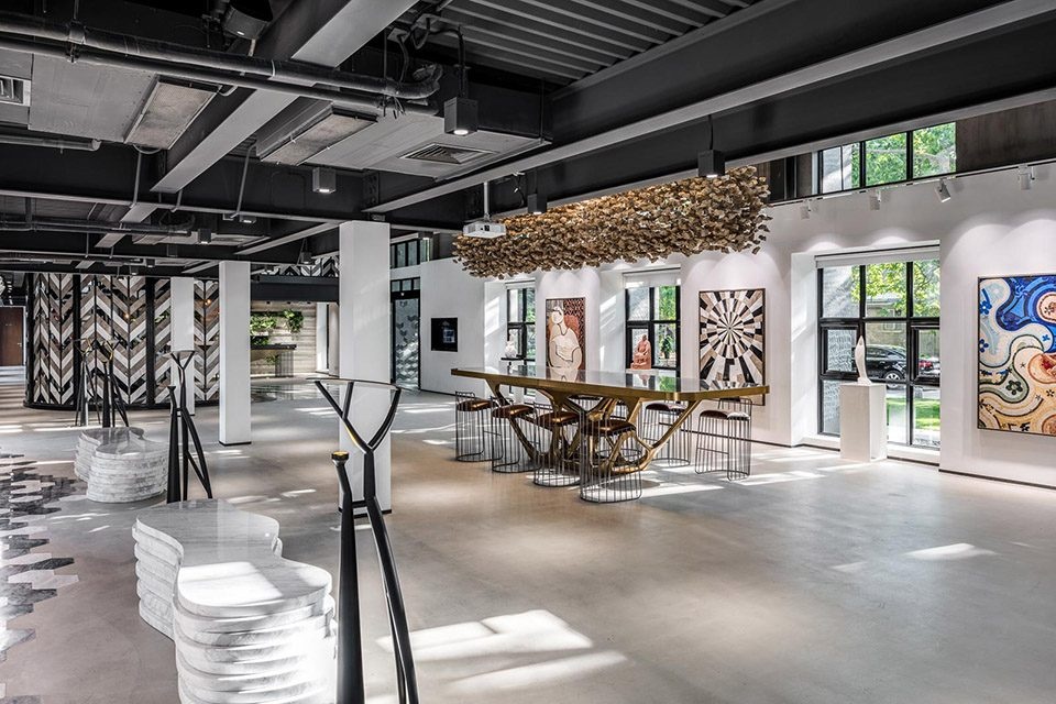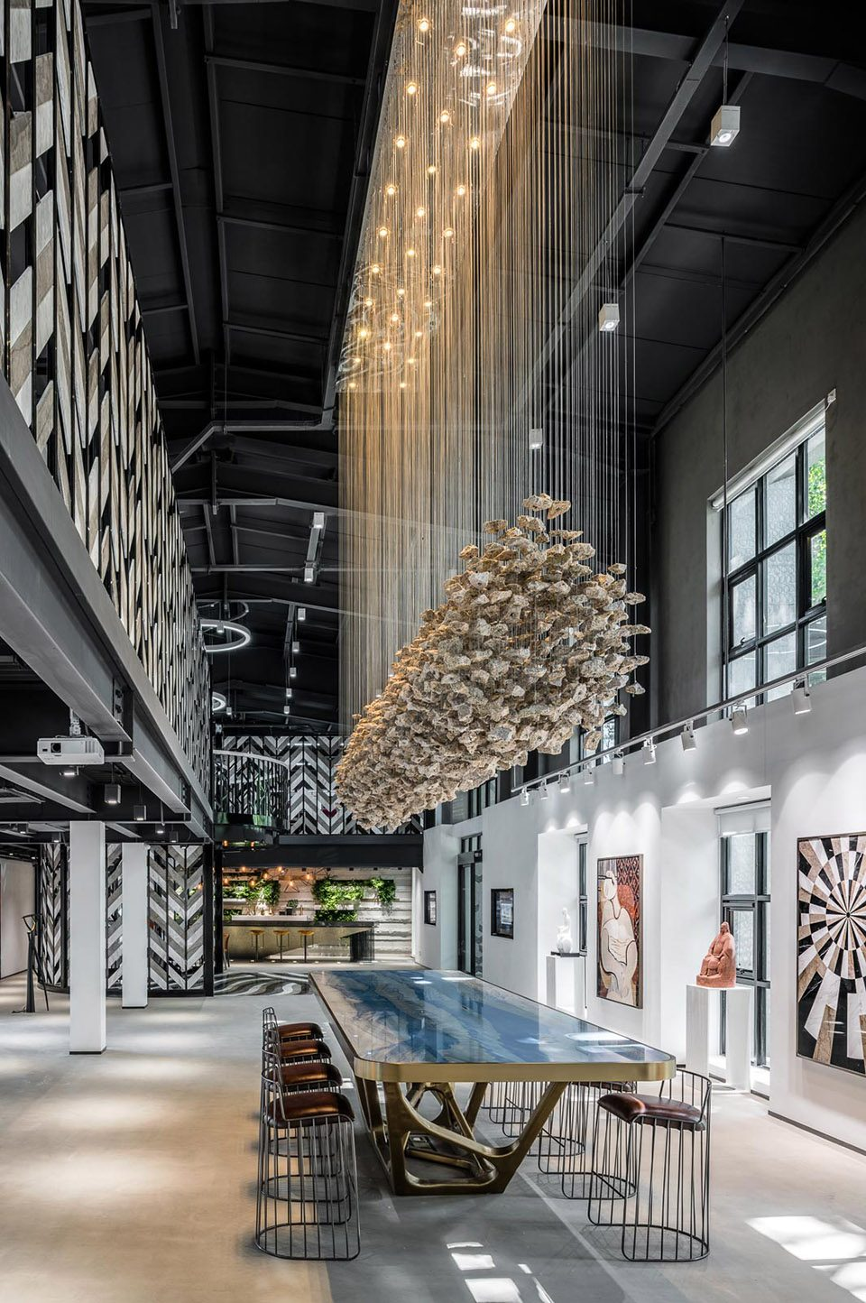 展示大厅,奢华石材做成的餐桌,餐桌上面吊着的石块,墙面展示的石材画作以及白色大理石层叠而成的弧线长凳,展示了石材作为软装材料的实景案例。