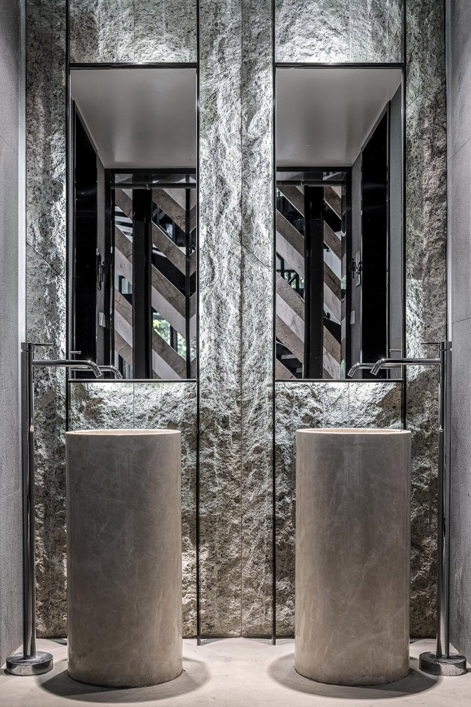 洗手间墙面采用灰色花岗岩断裂面,在灯光的照射下充满了自然原始的力量。