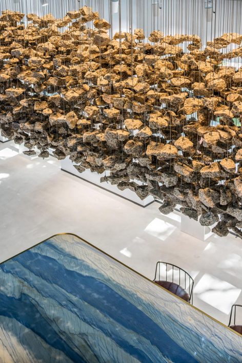 水池的设置主要是风水考量,入口有水,将是纳财的好兆头。球形的碎石头装置,是将石材的力量感最充分的体现,它的爆发与凝聚都结合在一起,是一种石头固有的力量—石力。