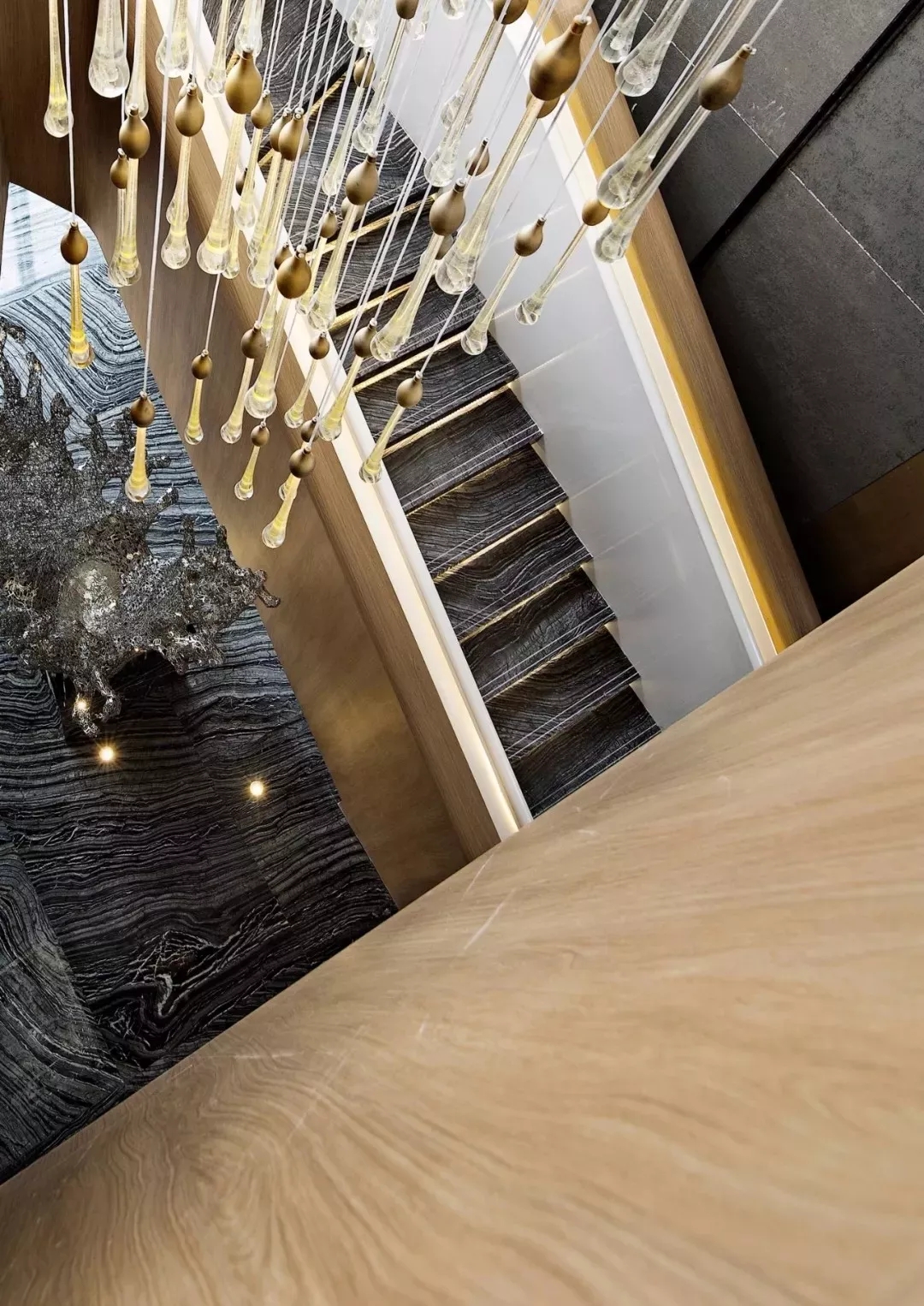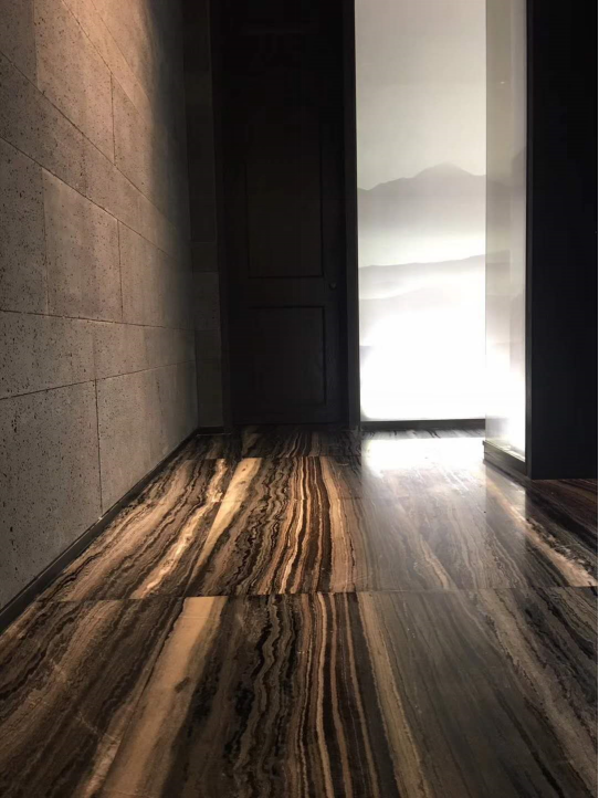 如果选用直纹板面会有极强的纵深感,起到指引的作用,深浅的纹理变化也会使板面变得生动有趣。云纹面则向从空中鸟瞰河流穿过山川大地,画面汹涌澎湃,变化无穷。