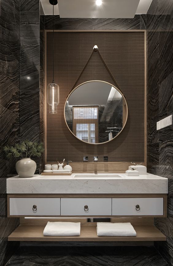 怪不得会被雅布一眼选中,用在深圳湾一号的样板间中,整个卫生间,没有其他任何搭配,大师就是大师,只用这一款石材,横向地拉出纹理,能量场已经足够了。