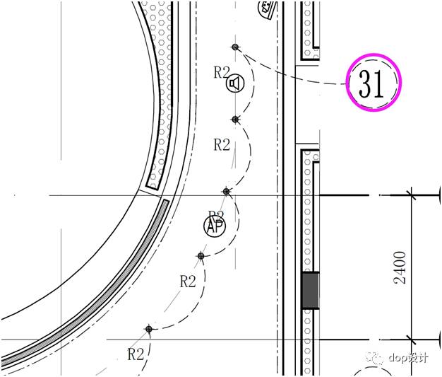 在天花造型较复杂,无法同时定位灯具的情况下分解出来的一张天花图,所以不再赘述。