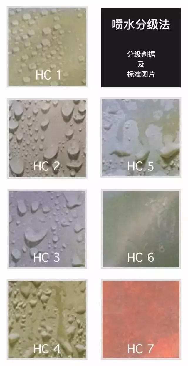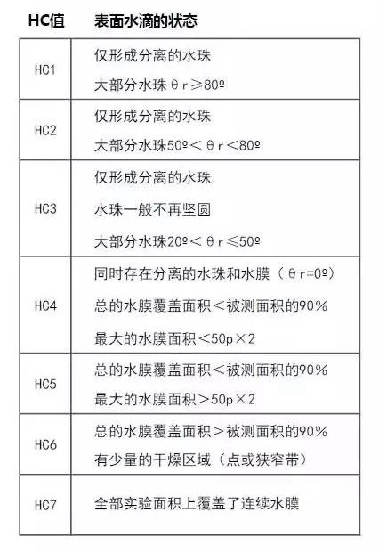 HC“1”代表θ的角度很大,越往HC “7”θ对的角度就越来越小。 表中描述了HC的七个等级的水珠特征。