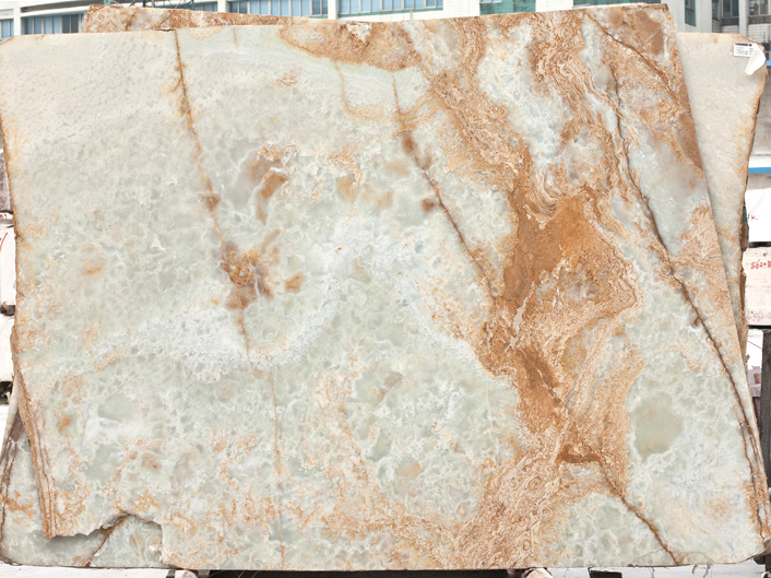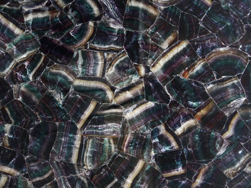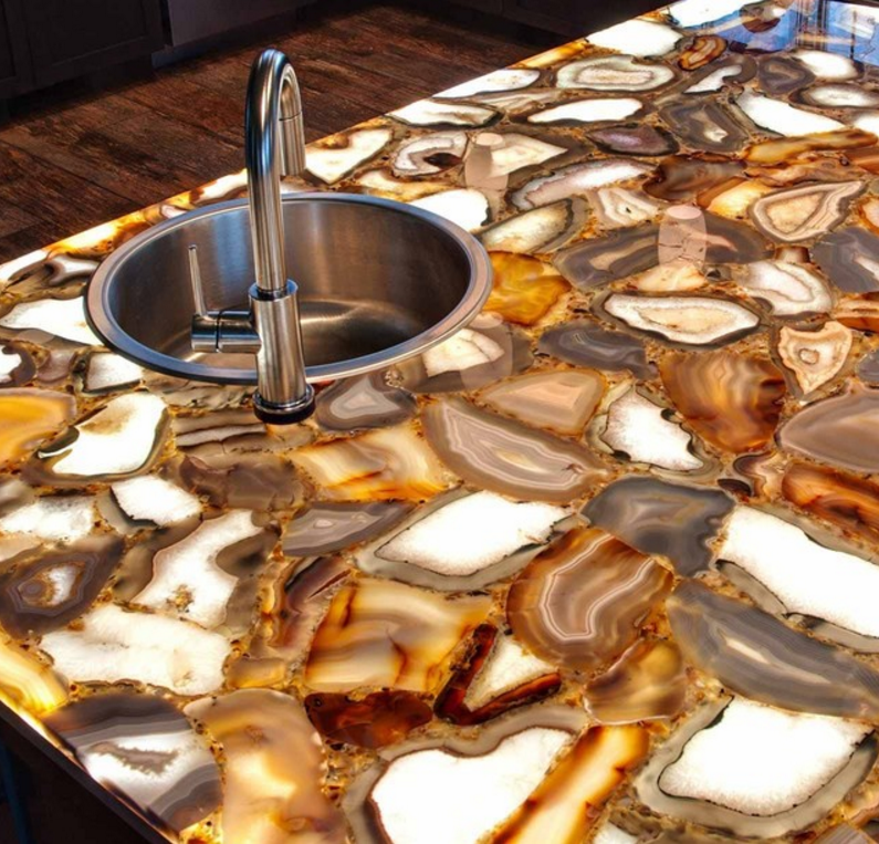 当然,奢华石材中有一类的产品是玛瑙石或半宝石切片,中间用环氧树脂进行粘结,所以它不耐高温,不建议用于零下10度及40度以上温度场景使用,如厨房台面等,如一定采用,必须将高温炊具与石材之间用垫层隔开,避免直接接触。