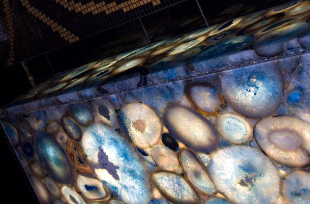 奢华的石材不同于常用的花岗岩和大理石,它主要是指天然石英石或半宝石,水晶及玛瑙等有着特殊的色彩和纹理的特色石材,比如:蓝宝石,亚马逊绿,铁红,林海雪原,鱼肚白等。
