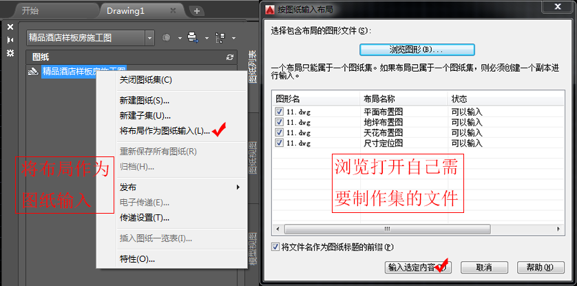 4、右击图纸集文件将布局作为图纸输入,浏览图形中打开自己需要创建图纸集的CAD文件,每一个布局即代表一个图纸集的子集。