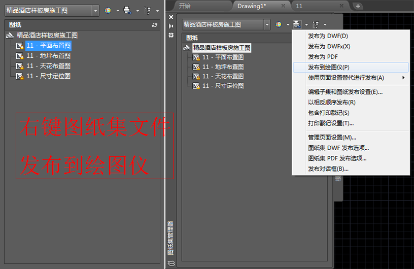 05.在已经做好图纸集准备工作(打印设置)后点击发布到绘图仪,就可以根据我们每个视口框定的区域,批量打印图纸了。